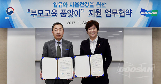 On Jan. 24, Doosan signed a partnership agreement with the Ministry of Gender Equality and Family to collaborate on the “Communal Parenting Education for Early Childhood Mental Health” program. The signing ceremony took place at the Seoul Government Complex, and was attended by Doosan Group Chairman Jeongwon Park and Eun Hee Kang, Gender Equality and Family minister.