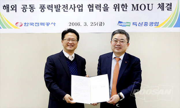 Doosan Heavy Industries & Construction (Chairman & CEO Geewon Park) announced on March 25 that it signed a Memorandum of Understanding (MoU) with KEPCO E&C to collaborate on the development, construction and operation of overseas wind power projects as part of their joint efforts to successfully penetrate the overseas markets.