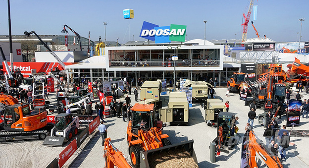 In its outdoor exhibition area (4,500m2), Doosan Infracore featured ten excavator models, three wheel loader models and one articulated dump truck (ADT) model, together with Doosan Bobcat's mini excavators, skid-steer loaders and compact track loaders, as well as a wide selection of attachments. The company also introduced its compact diesel engine (G2 engine) and Doosan portable power products.