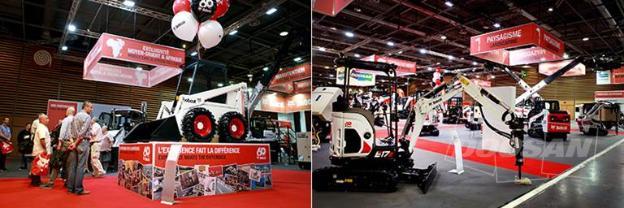 (Left) Doosan Bobcat showcases its compact loader models to celebrate the 60th anniversary of launching its first loader at the Intermat 2018 in Paris, France.