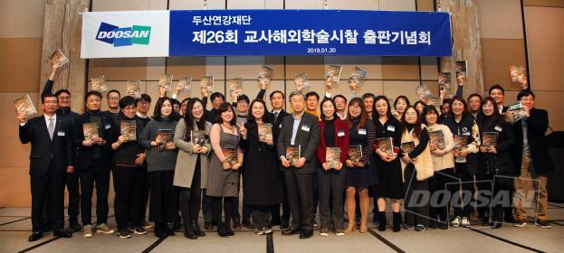 Chairman Yong Hyun Park (front row, eighth from left) poses for a photo together with the schoolteachers at the ceremony celebrating the publication of the Doosan Yonkang Foundation’s travel essay book at Millennium Seoul Hilton on Jan. 30.