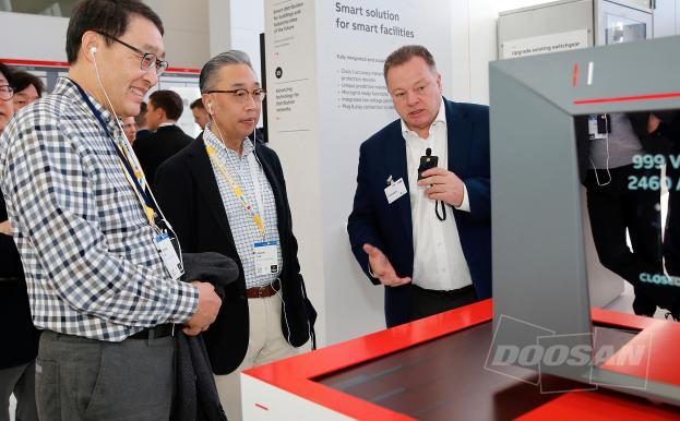 Doosan Group Vice Chairman Geewon Park (second from left) listens to an explanation about renewable energy equipment revealed for the first time by ABB, a Switzerland-based engineering company, during his visit to Hannover Messe 2019.
